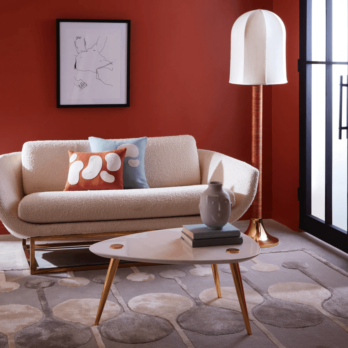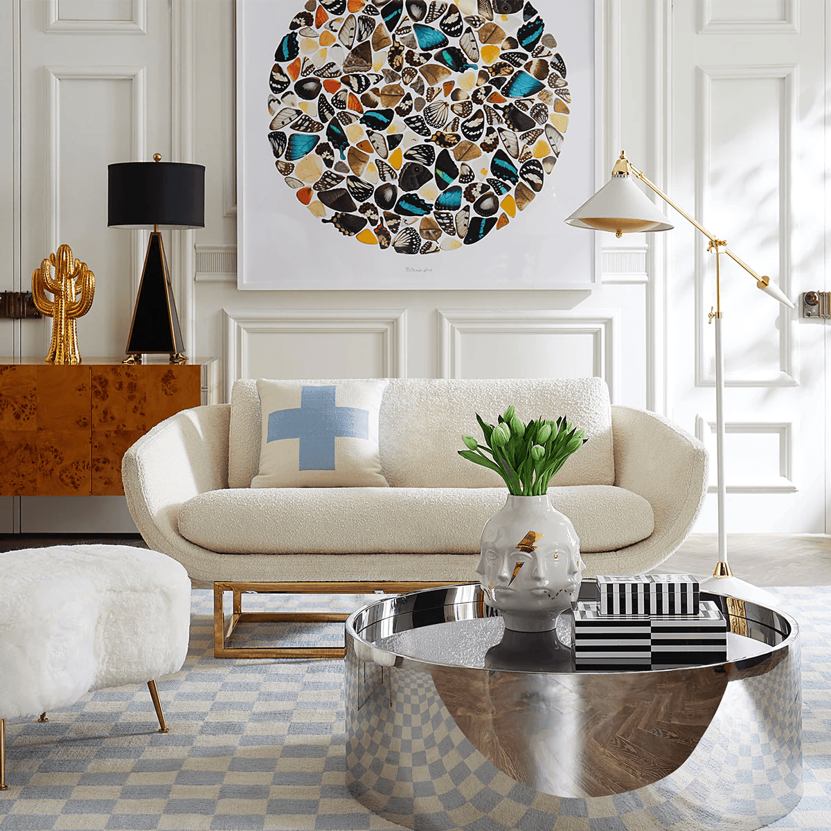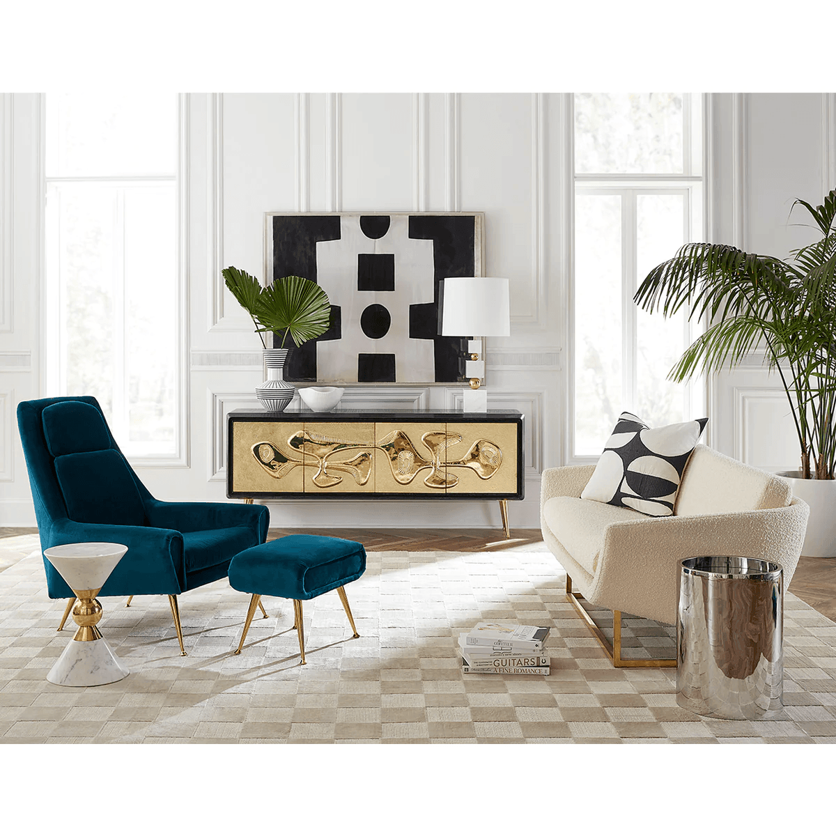 Minimalistische Strenge trifft auf kuscheligen Komfort. Die architektonischen und doch luftigen Sockel der Beaumont-Kollektion von Jonathan Adler werden durch skulptural anmutende Silhouetten aufgeweicht. Gleichgewicht und Geometrie werden durch glänzend poliertes Messing glamourös aufgewertet.