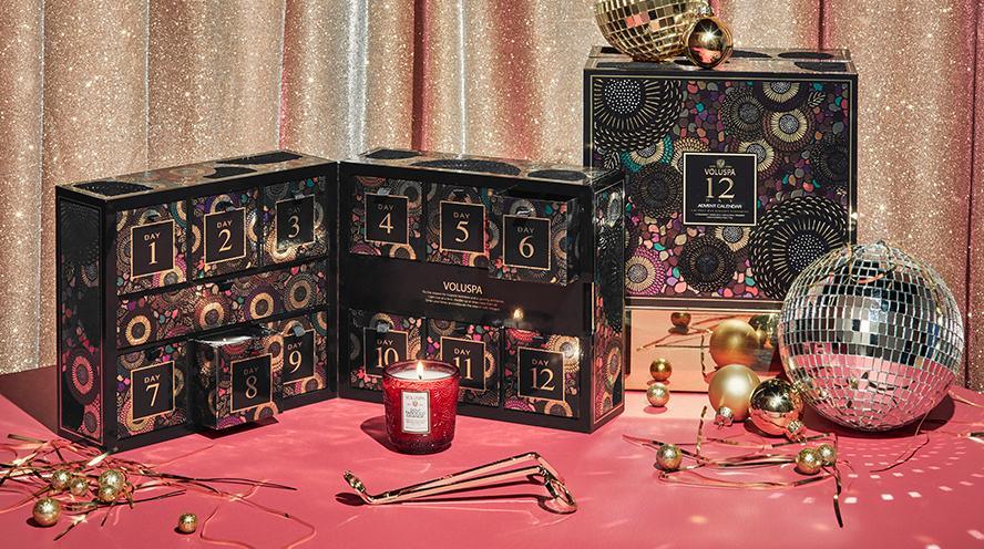 - Luxuriöser Adventskalender bestehend aus den 12 Bestseller Düften der Japonica & Holiday Kollektionen von Voluspa und einer Dochtschere